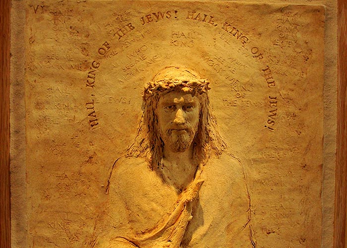 John 19: 2 – 3 2 And the soldiers wove a crown of thorns and put it on his head, and they dressed him in a purple robe. 3 They kept coming up to him, saying, “Hail, King of the Jews!” and striking him on the face.